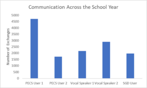 In Molly’s classroom, data were collected on daily use of the Picture Exchange Communication System (PECS) phases IV-VI. Two elementary aged students used PECS
